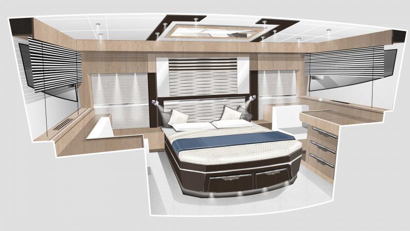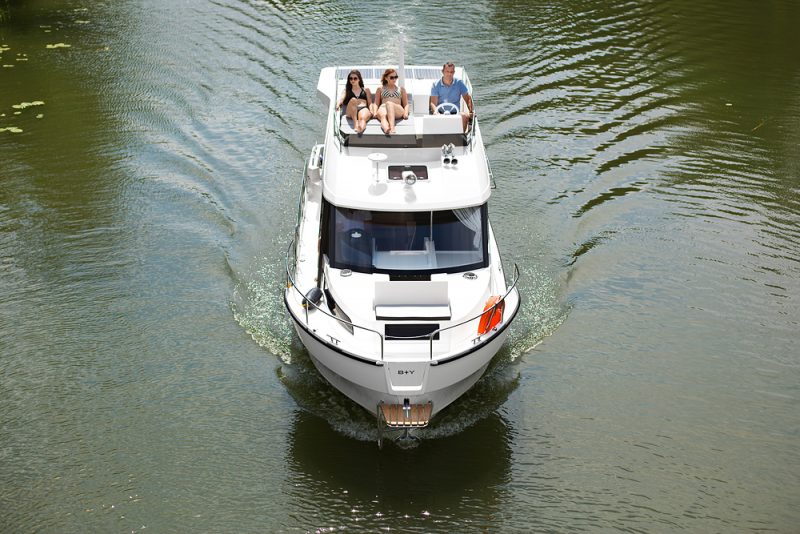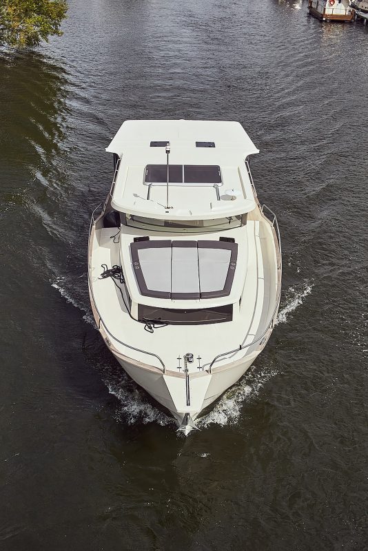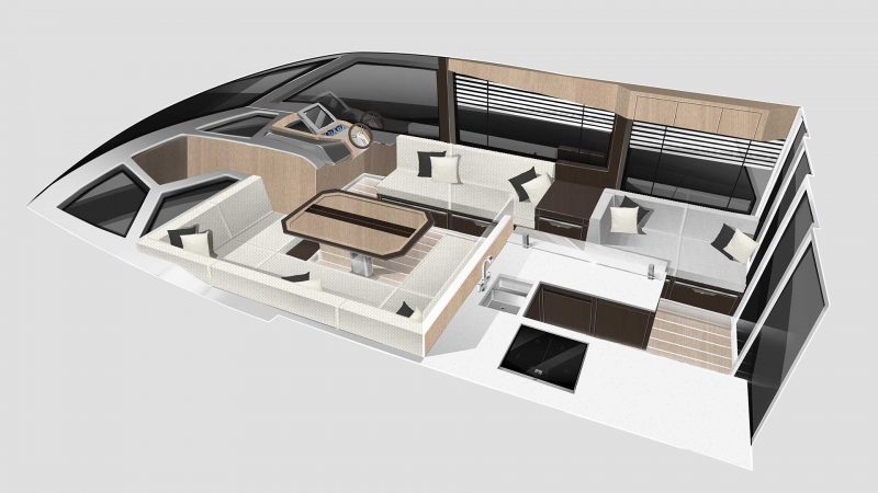 Na górny pokład z łatwością dostaniemy się komfortowymi schodami. „Flybridge” jako główne centrum rozrywki, oferuje mini bar oraz stanowisko sternika. Stolik oraz kanapę można szybko zmienić w poręczną, dużą przestrzeń do opalania. Pod pokładem znajdują się w 2 komfortowe sypialnie, w tym jedna z prywatną łazienką.
