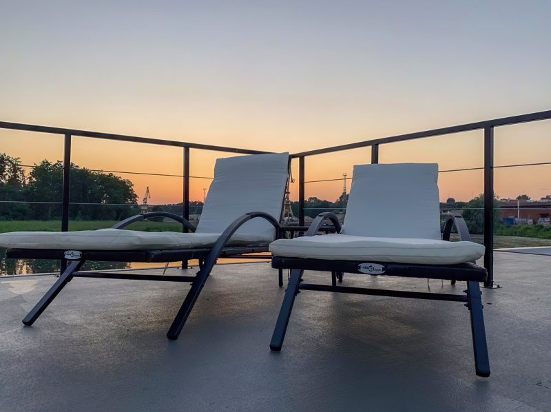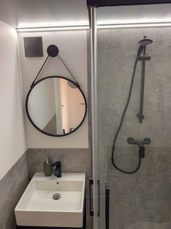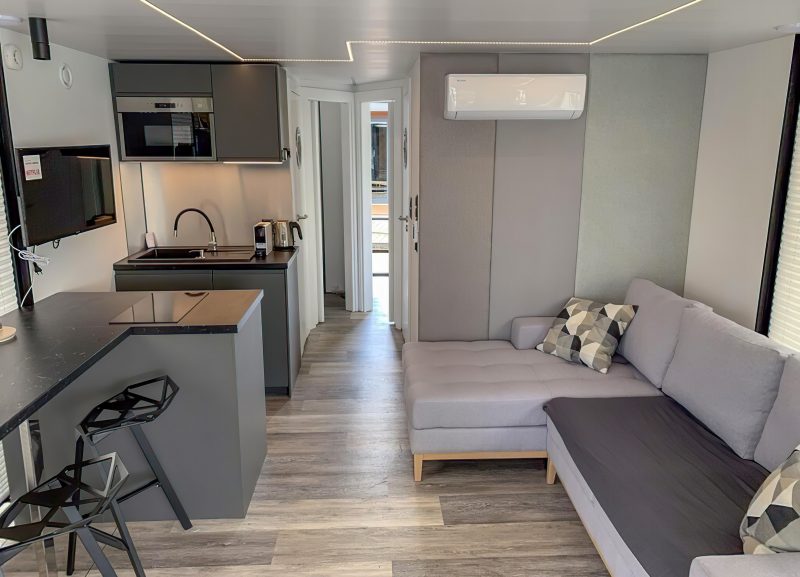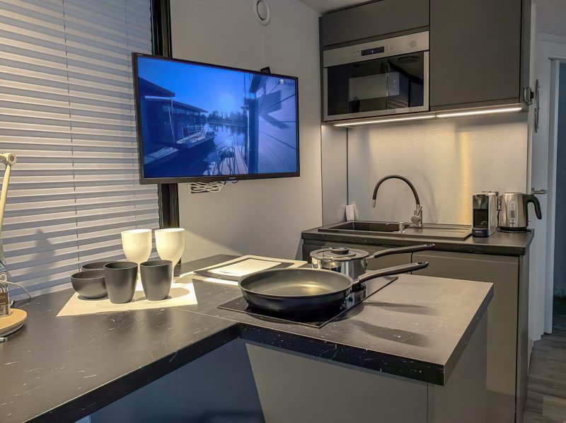 W prezentowanych pływających apartamentach dostępne są 2 sypialnie, aneks kuchenny ze zmywarką, telewizor z płaskim ekranem, część wypoczynkowa z rozkładaną sofą oraz łazienka z prysznicem.